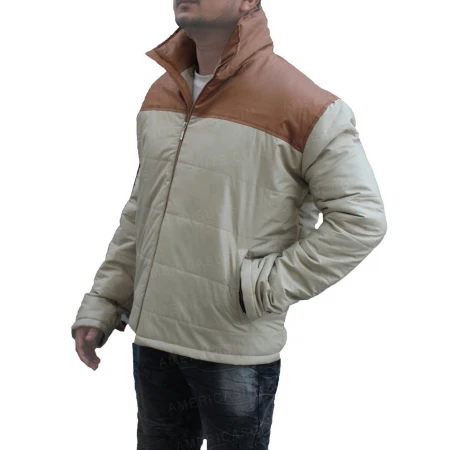It’s designed in a khaki color but the upper shoulder side, a brown color detailing present makes an appealing combo with the base color. This Resident Alien Jacket crafted by using a top quality parachute as an external covering and the interior side covered from soothing viscose fabric. A handsome standing style collar reaches downwards to the level of a smooth zipper fastening closing, both will grant you a fitted and charming look at the same time. Open hem cuffs and full length sleeves, present for the complete picture appearance. As clearly seen, there are two welted pockets on the outer waist side of Mayor Ben Hawthorne. A padded design features the entire jacket, courtesy of the parachute external covering. Buy it now!