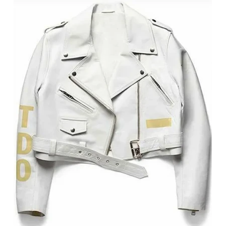 The outer covering is made from PU leather material in an attractive white color, slaying your persona when pairing with black or other impressive jeans and sneakers. On the front side, Robyn Rihanna Biker Jacket holds a specification of YKK zipper fastening closing, adjusted accordingly with the help of an adjustable waist buckle belt feature. A collar is designed in a notch lapel style, considered as one of the impressive specifications of the jacket. Button straps are present on the shoulders along with the multiple outer zipper pockets. These mentioned things will enjoy, peacefully a whole day, just because of the presence of the viscose lining on the inner side.