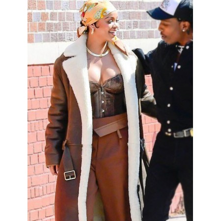 The most exciting and trending outfit, the RIHANNA LONG SHEARLING LEATHER COAT, is ready to give you a cool look. This long and amazing coat can change your style game within seconds and turn some heads for you with its extensive charm! Captivating in style, this Brown Long Shearling Rihanna Leather Coat is made from pure quality leather. The inner is made comfy and smooth to give the wearer warmth and a comfy feel. It is given a stylish look by front belted closure. Also, the brown color is itself an iconic symbol of fashion. Its long sleeves are fully fitted with open hem cuffs. The lapel shearling collar makes it classy and elegant. Moreover, in short, it has the ability to grab the attention of the public towards you. Its styling is done in a very charming way. The cool features bring a glance into your personality. You can wear it with slim-fit jeans and loose trousers. Also, it's best for both outdoor and indoor gatherings.