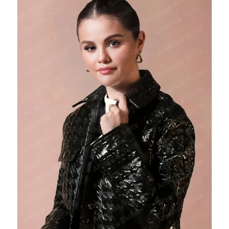 - Elevate your style with the Selena Gomez Houndstooth-Pattern Biker Jacket.