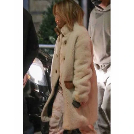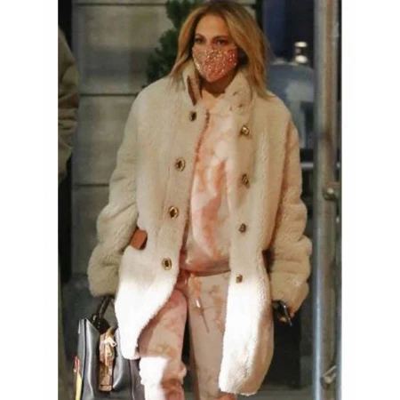 Now let's come to the Christian Serratos as Selena inspired Selena The Series Jennifer Lopez Fur Coat. The nutshell covering, made from shearling faux fur material, meanwhile the inner side, covered with viscose lining. Both make this coat one of the softest and comfortable attire to wear, from generation to generation. There are two button flap pockets on the waist side, utilized by securing all the belongings into them. A brown color button specification present on the frontage for the opening and closing procedures, which now becomes convenient with the help of it. The collar is designed in a shirt style, like the same as shown in the picture. Open hem cuffs and long sleeves are also a part of it. Available in an off-white color, the reason behind the dynamic and dreamy looks.