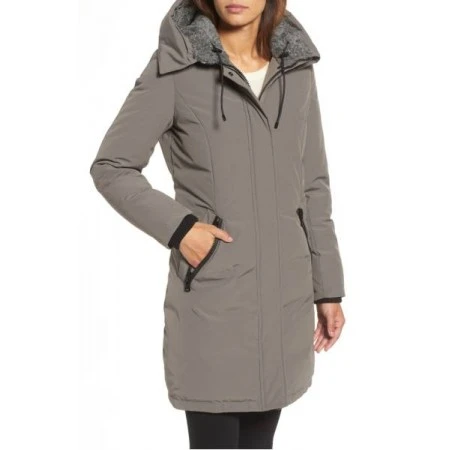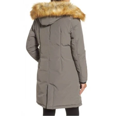 An icy climate waterproof satin in a female A-line outline gets a twofold dosage of comfort from an overlay of faux shearling to warm the neck and a lavish ring of artificial coyote hide besting the hood.