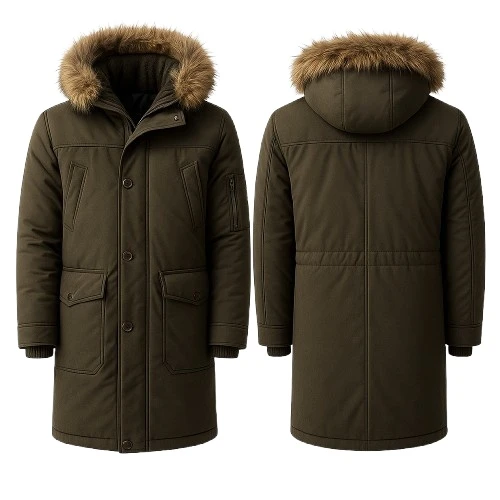 - Collar: Hooded with faux-fur trim