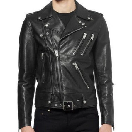 Fashionable Black Belted MotorBike Black Leather Jacket
