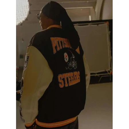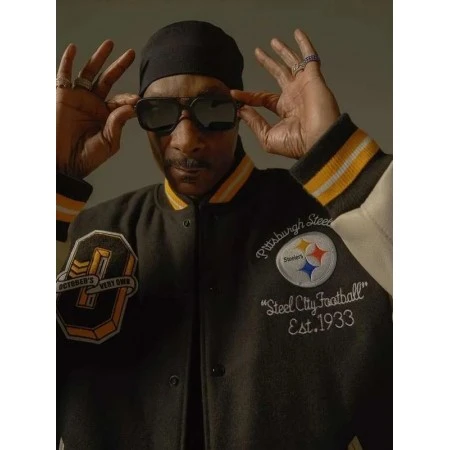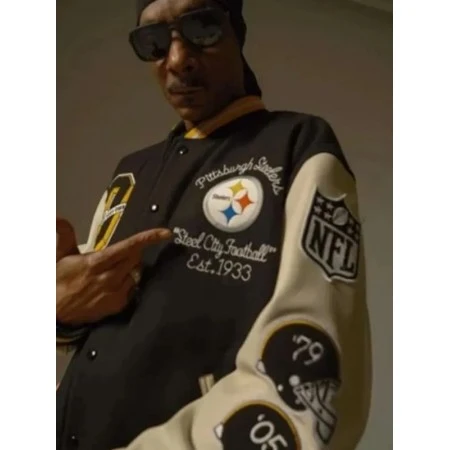 The Snoop Dogg Pittsburgh Steelers Varsity Jacket is getting much hype nowadays. This is because of its stylish design. It is being inspired by Snoop Dogg. A real leather and wool fabric blend is used in the crafting of its external surface. While a viscose lining is present on the inner side. There is a front closure having buttons for enhanced protection. Moreover, a ribbed collar is also present which increases the style and design of this outfit.