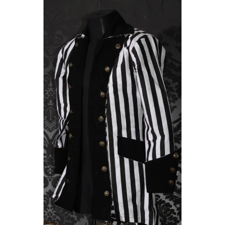 The Steampunk Striped Pirate Jacket is the perfect choice for any pirate, officer, or fashion enthusiast! This striking piece of outerwear features black and white stripes with black lapels, cuffs, and collar, as well as antiqued buttons running down the front and on the sleeve cuffs. The open style of this jacket is perfect for showing off a stylish vest or another piece of gothic apparel.