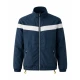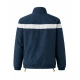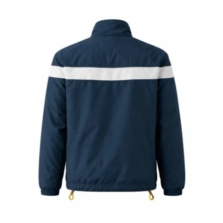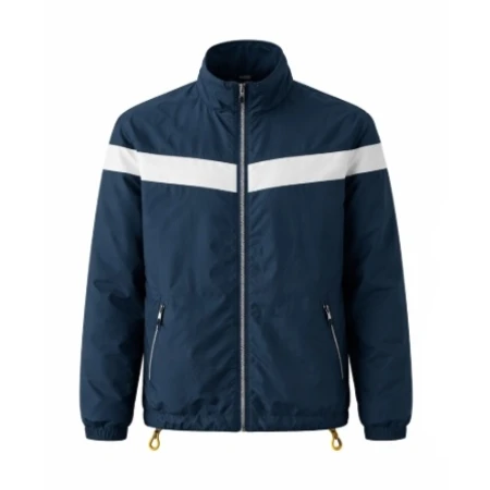 It features a front zipper closure, giving it a simple look suitable for daily use. It also has a stand-up collar that gives a sharp look to the neckline of a person wearing it. The white color and the navy blue color are a perfect match because they are easy to mix with a casual or semi-casual outfit. There are two zippers on the jacket, which are used to carry small necessities in two separate compartments, and it also has cuffs that are elastic in nature.