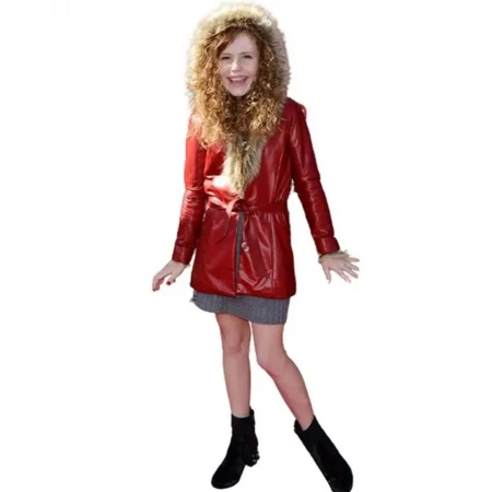 The Christmas Chronicles 2 Darby Camp Premiere Coat! This luxurious coat is made from premium leather and features a shearling style hood, lapel design collar, full-length sleeves, and a shearling style belt closure. It also has two front pockets and a shearling-style open hem cuff. The coat is available in a hot red color, making it the perfect addition to any winter wardrobe.