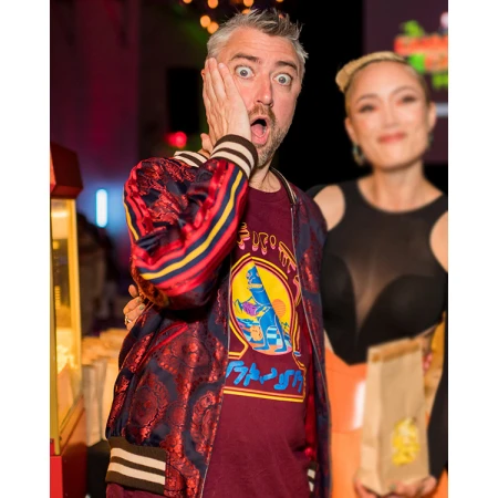 Look no further than The Guardians of the Galaxy Holiday Special Sean Gunn Jacket! This jacket is made from satin material and features a soft viscose fabric lining, rib knitted collar, long sleeves, rib knitted cuffs, and two waist pockets outside and two pockets inside. The front of the jacket is open with a zippered closure. The black and red colors are sure to make you stand out in a crowd.