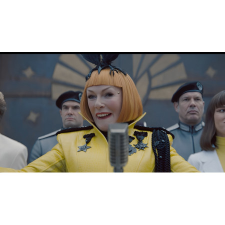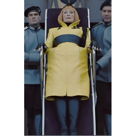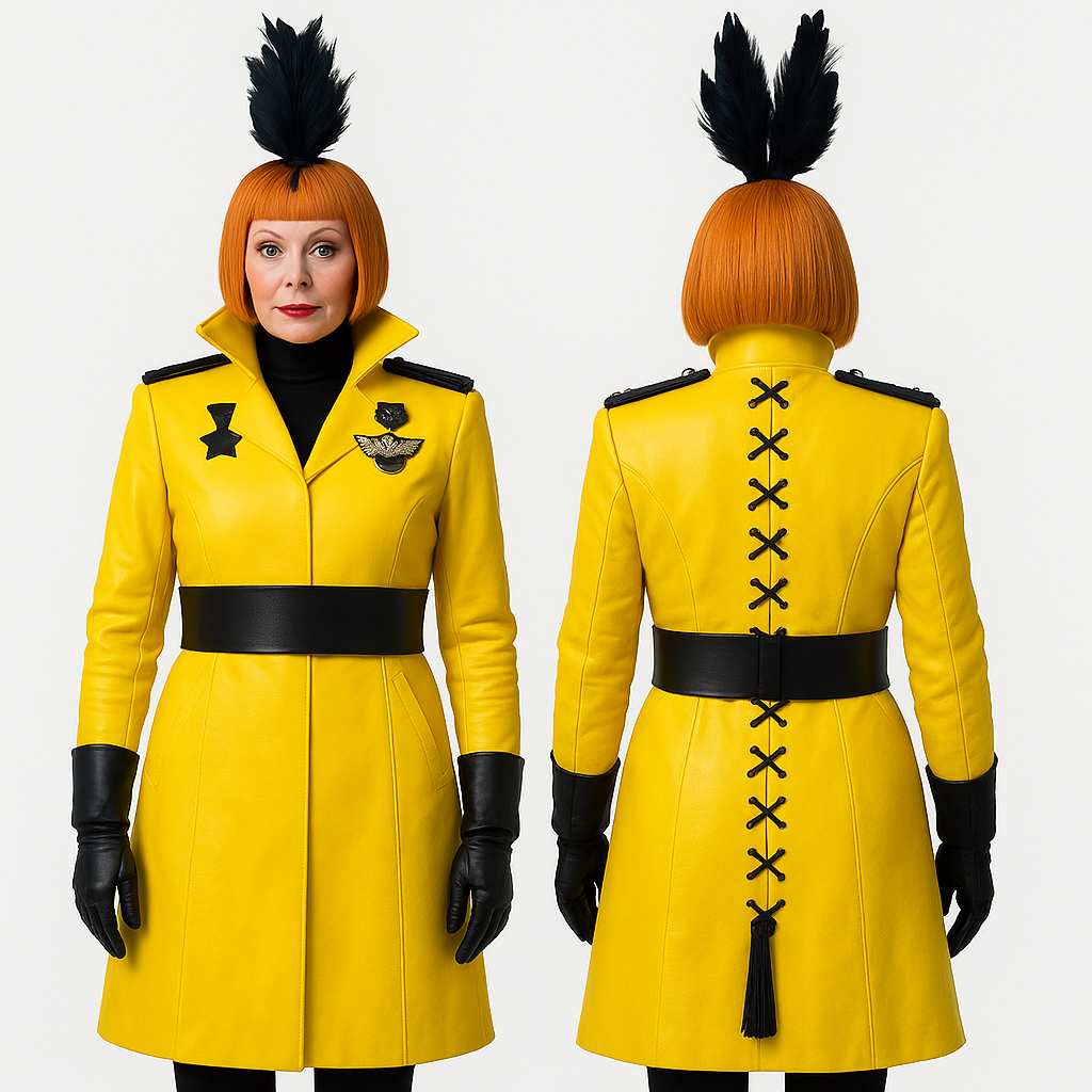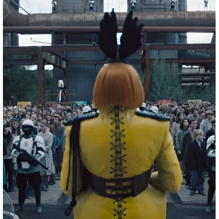 The bloodcurdling yellow-orange outfit inspired by The Hunger Games: Sunrise on the Reaping and donned by Glenn Close as Drusilla Sickle is made from an ultra-sophisticated polyurethane leather, with smooth viscose lining for breathable comfort. While electric yellow is magnificent, the sharp sci-fi edge emerges through contrast black detailing.