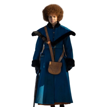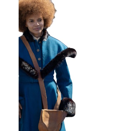 Sophisticated Design: With its striking blue color and graceful design, the coat reflects the iconic style of Leslie Grace’s character. A stand-up fur collar, front buttoned and belted closure, and open-hem fur cuffs add a touch of high fashion to your everyday life.