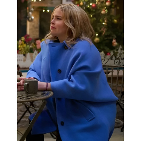 Mae Whitman Blue Wool Coat; The Twelve Dates Till Christmas brings in a nicely homey feel, like that of winter in the city, into your daily wardrobe. This coat is a lovely seasonal touch, as warmly given, outwardly thin, for heading somewhere in a loosely hanging outfit for the coffee grab, through the chilly evening walks, or just wanting to have on someone warm, not bulky, to pass casuals. A comforting coat that will keep you classy, an understated elegance that can take you from just walking around errands on the weekdays to special outings on holidays.