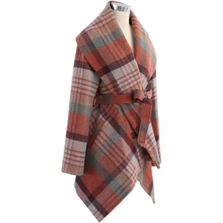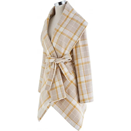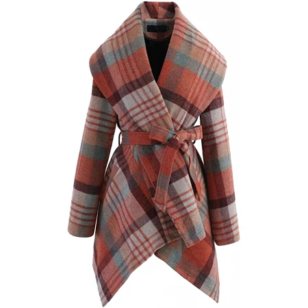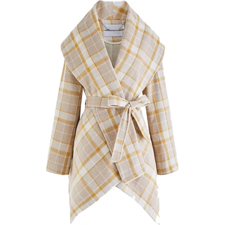 Look no further than this Turn-Down Shawl Collar Earth Tone Checked Coat! This coat is made of fleece for warmth and comfort and features a double-breasted front, open hem cuffs, long-length sleeves, and a belt closure for a perfect fit. With its printed design and earth-tone checked pattern, it's sure to turn heads. Put on the coat and secure the belt closure for a perfect fit. Enjoy the warmth and comfort of the fleece material. Show off the stylish printed design and earth-tone checked pattern.