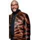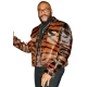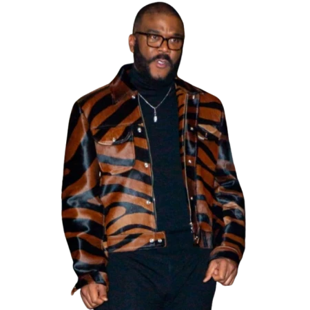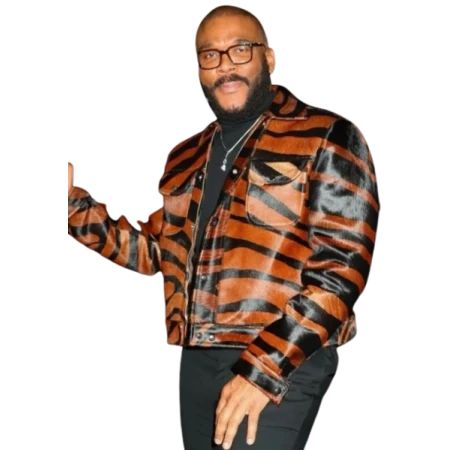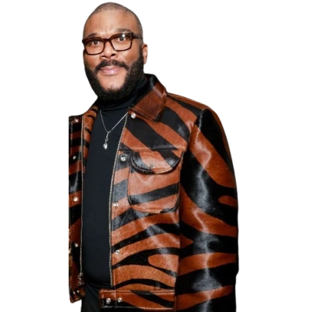 Elevate your style with Tyler Perry The Six Triple Eight Leather Jacket a stunning piece inspired by the iconic director, crafted from high quality Genuine Sheepskin Leather This black printed jacket has a shirt-style collar and a sleek zipper closure for a modern touch.