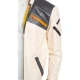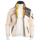 - White with a stand-up collar: The jacket is a sleek white color with a stand-up collar.