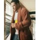 The outer layer of the robe is made from a wool blend material in a brown shade, as shown in the picture. The inner lining is made from comfortable viscose. The robe has a front open style with a v-shaped neckline for a sophisticated look. It also features two pockets at the waist.