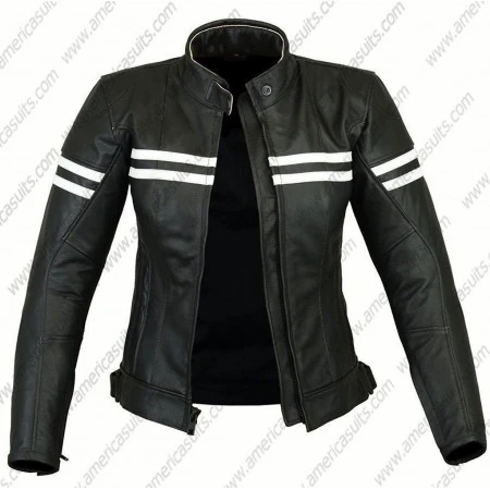 For all the riding girls, this Women's Black Biker Jacket With Stripes is made from genuine leather with stripes and has a zipper closure on the front. The jacket has a basic and simple design yet is elegant enough to dress up like a fashion-designed jacket for outdoor needs. It has front and inner pockets and an inner viscose lining quilted and stitched to give you extra comfort. This impressive black leather jacket is perfect outwear for all the ladies.