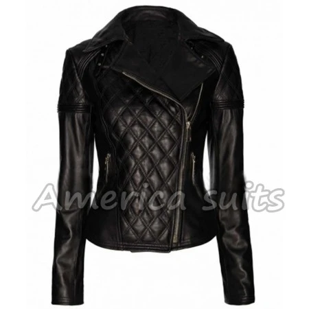 It has a pleasantly planned shirt-style neckline with a clasp and stitched Hilter kilter board at the front. Metal zipper securing is utilized for shutting. The Backboard, shoulders, and upper segment of sleeves are likewise sewn making this coat fantastic. Women's Black Leather Biker Jacket epitomizes two zipper pockets on the waist making it look altogether furthermore striking. Full sleeves enhanced with zipper sleeves. In a dark tint, Women Quilted Jacket symbolizes the personality of the person who wears it and gives a vibe of outmaneuvering offer.