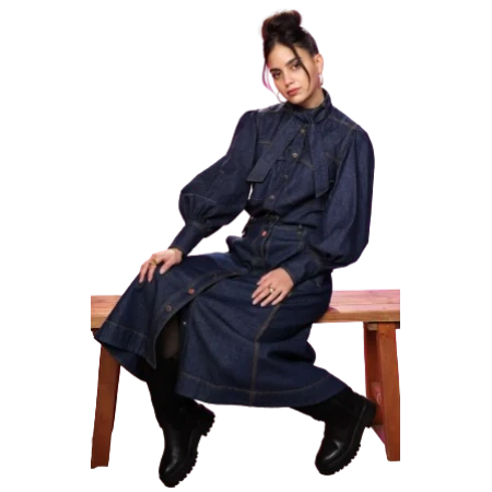 the denim coat complements it. The piece is modern styled; even if the fabric –
